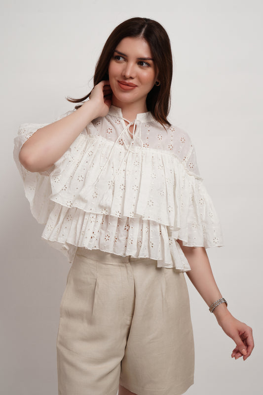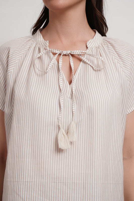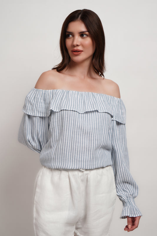 Blue Striped Double Gauze Linen Blend Off Shoulder Top